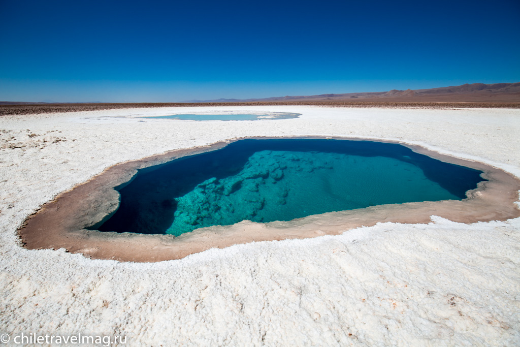 Лагуны Балтиначе (Lagunas Baltinache) – это 7 крупных лазурных водоемов кристальной чистоты посреди гигантского белого солончака Атакамы. Уникальный пейзаж, который есть только в Чили. Приятный бонус – лагуны пока еще не раскручены массовым туризмом.